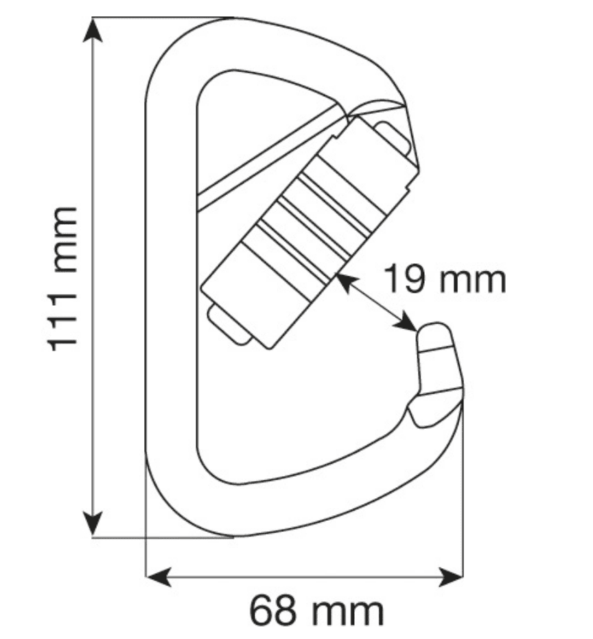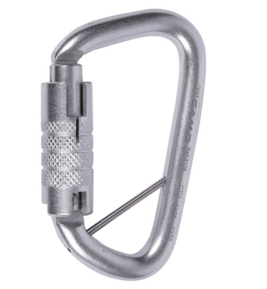 High strength steel carabiner equipped with removable anti-rotation pin.