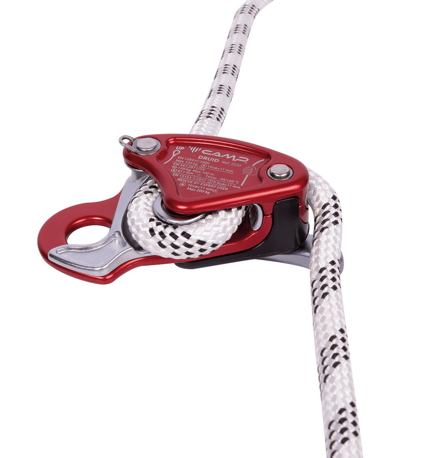 Anti-panic function in the lever re-engages the cam if the handle is pulled too far where it could lead to unsafe descent speeds. The body and lever are made of robust hot-forged aluminum alloy. Mechanical parts are made of precision-cast stainless steel. The internal mechanism and locking cam use a innovative design for smooth action on the rope which prevents rapid wear-and-tear and absorbs energy from small shocks with a slight amount of rope slippage. The fluid action on the rope also allows the Druid to function well for rope ascent. The cam can be de-activated with a trigger to allow quick sliding of the rope in situations with no load or limited load. Includes a steel ring for attaching a keeper cord.