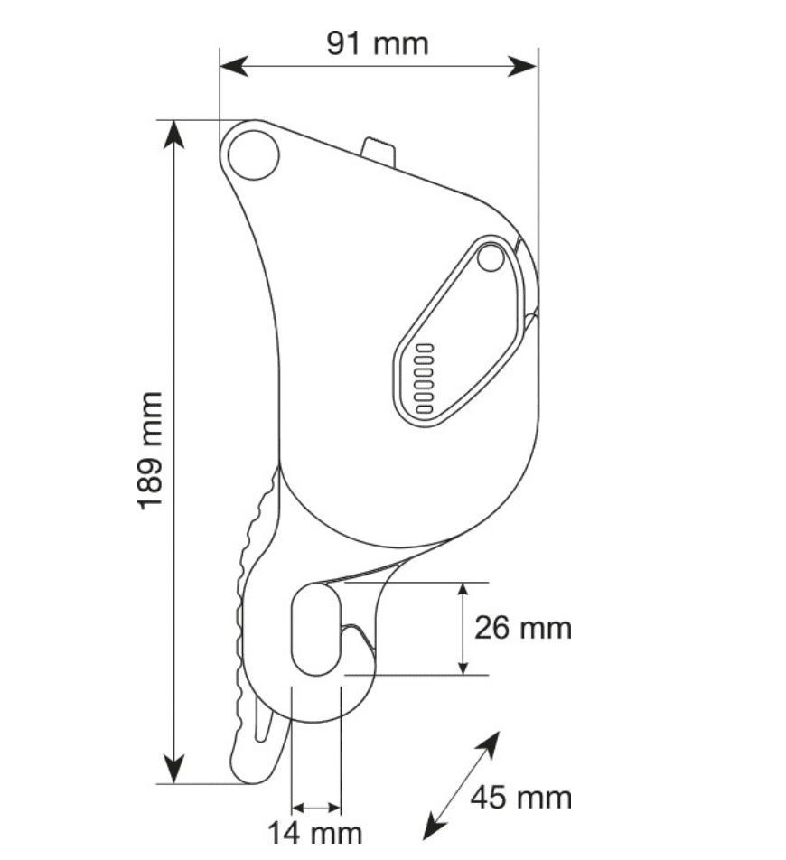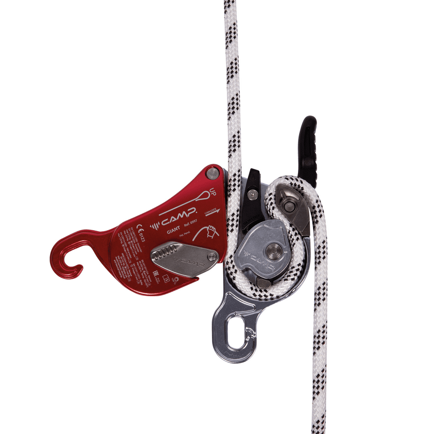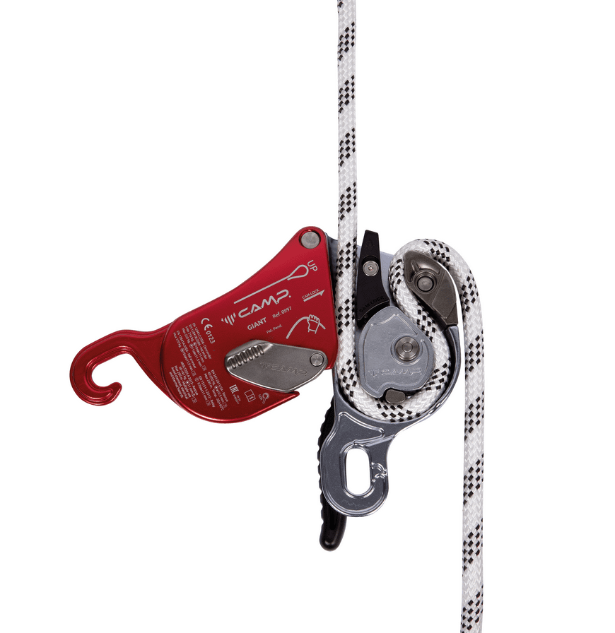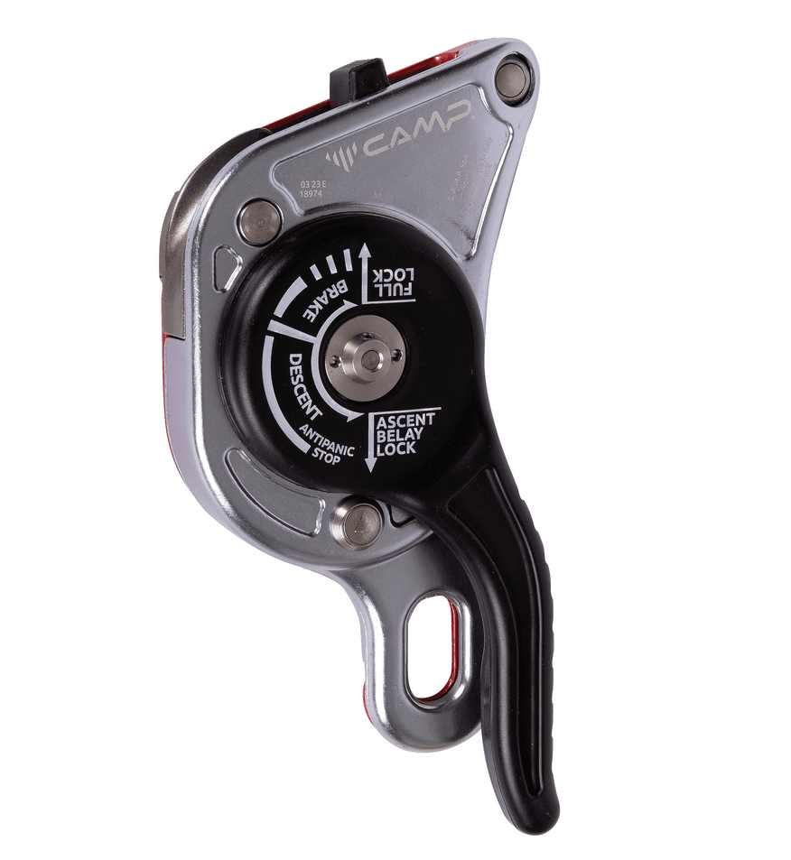 The internal mechanism combines with robust hot-forged construction and advanced ergonomics for exceptional control even with heavy loads (up to 250 kg/551 lbs. for two person scenarios). In addition to its primary function as a descender, the Giant is also certified for use as a fall arrest device (i.e. during rope transfers), as an ascender with smooth upward glide, and as a belay device for climbing, making it the most widely certified rope tool of its kind. The actuating lever features an anti-panic system that locks the rope and arrests the descent in case of excessive pressure on the lever by the user as well as an extra lock off position so the worker does not have to tie off the device. An external button can be used to hold the cam open allowing the rope to slide easily in situations with limited or no load. The device can be opened to insert or remove the rope without removing the carabiner (this helps prevent the possibility of dropping the device). The large attachment hole allows for the insertion of a second carabiner making the two plates unopenable. The logical circular rope path along with clear internal and external markings makes installation of the rope simple and intuitive.