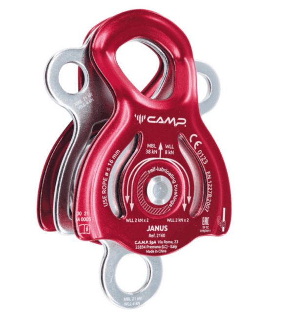 A high strength multifunctional double pulley for block-and-tackle systems and complex operations.