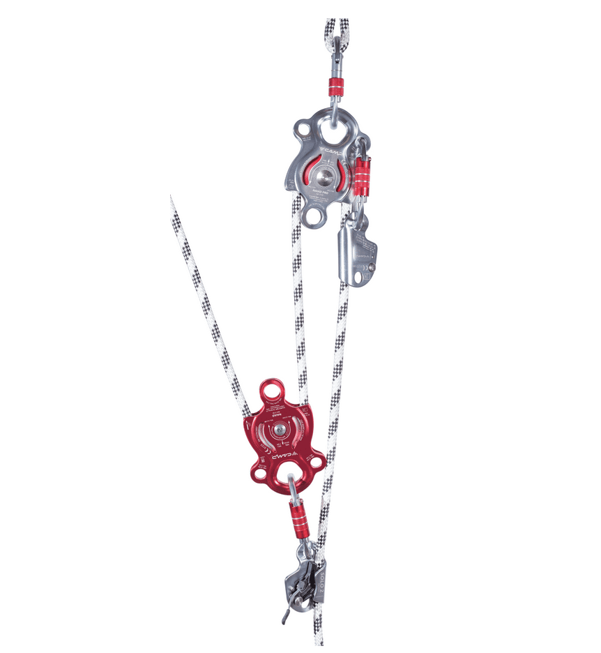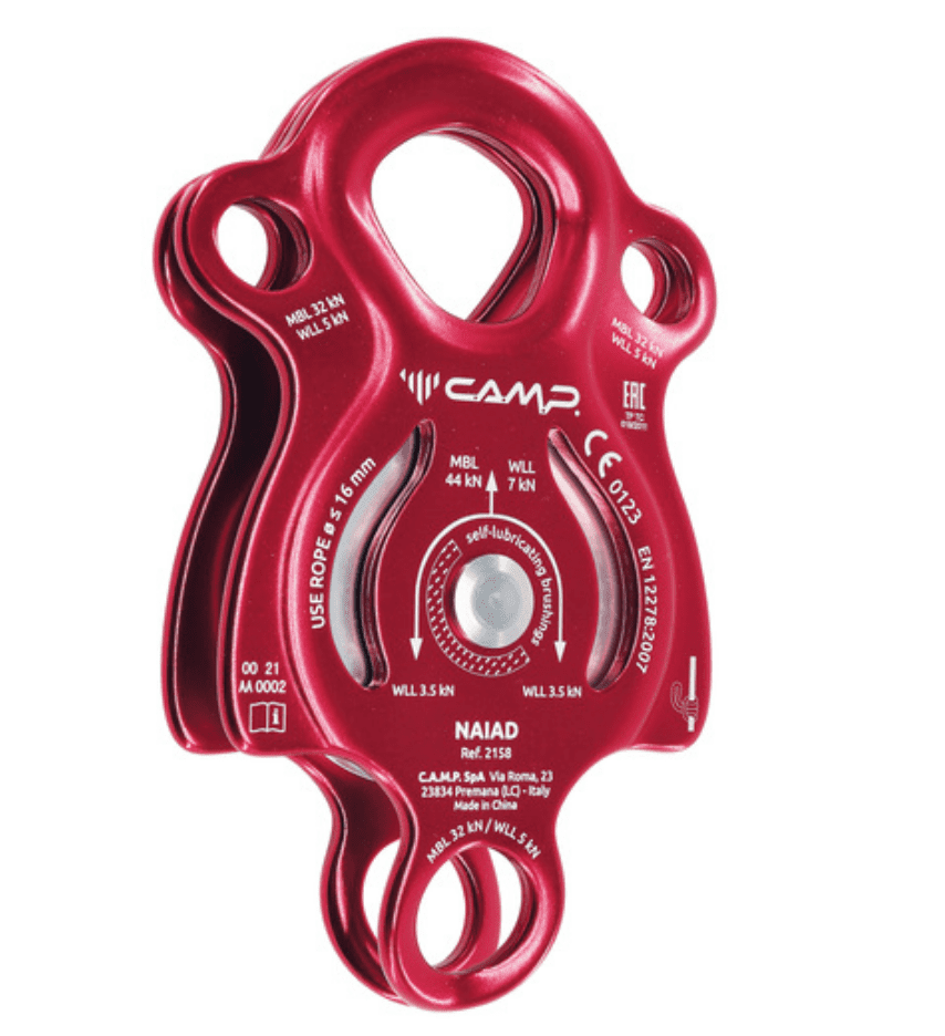 Features a large wheel, a main attachment point that accommodates three carabiners, a large bottom attachment point, and two secondary attachment points on the sides for linking, positioning and attaching progress capture systems. For use with ropes up to 16 mm. Prusik minding, the self-locking knot can be installed on both sides. Self-lubricated bushings are sufficient for light applications at low speed.