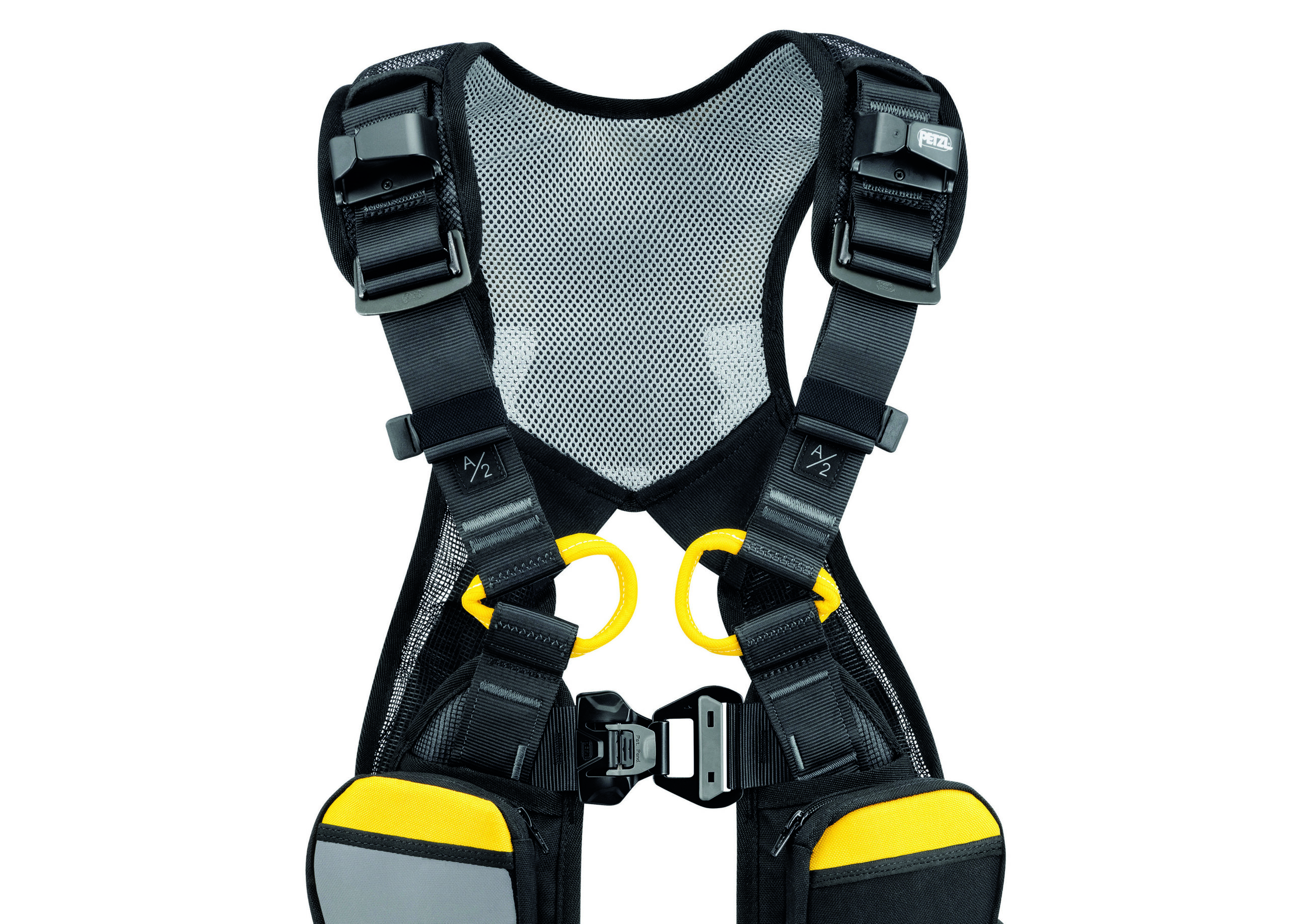 – Stowing system for the MGO connectors on fall-arrest lanyards are located on each shoulder strap; in the event of a fall, the system releases the MGO connectors and allows the absorber to be deployed