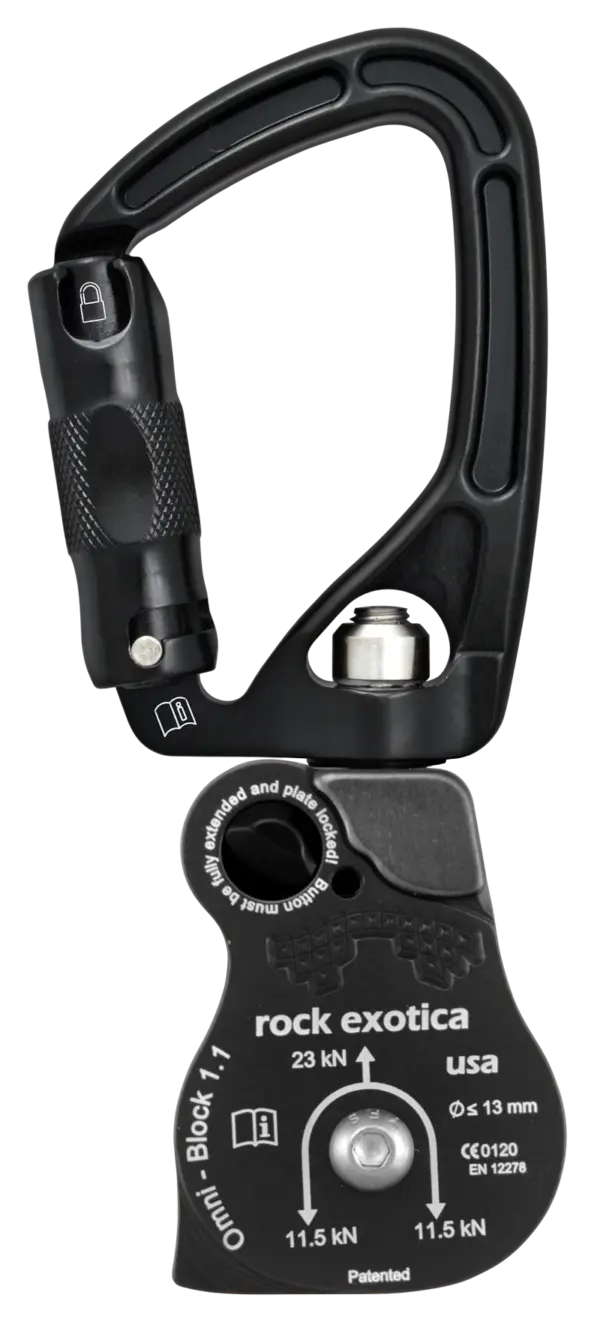 The Omni-Block SwivaBiner combines a swiveling carabiner and pulley into one tool, and incorporates a unique sideplate that opens while the pulley is still attached to the anchor.