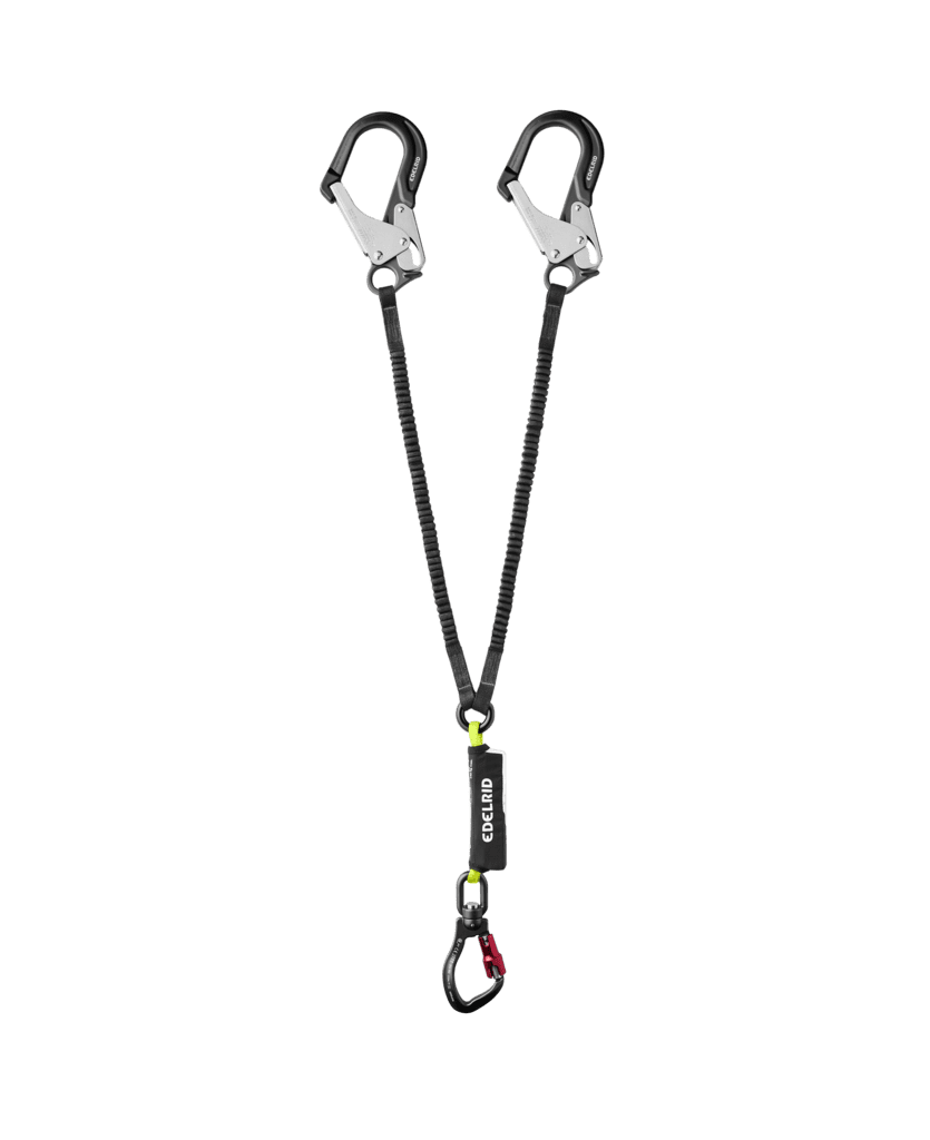 Y-lanyard with elasticated arms, an integrated shock absorber, and large aluminum palm carabiners. Ideal for use in the field of scaffolding as well as for securing to and moving along anchor points or structures and progressing on lifelines, including for passing protection. The shock absorber is designed for a high load capacity of up to 140 kg. The individual carabiners and the SHOCKSTOP-Y 140 GIANT ANSI as a system have been edge tested. The integrated swivel carabiner for harness attachment prevents the arms from twisting during use.