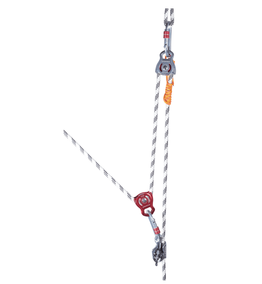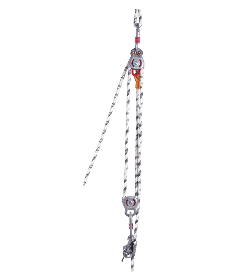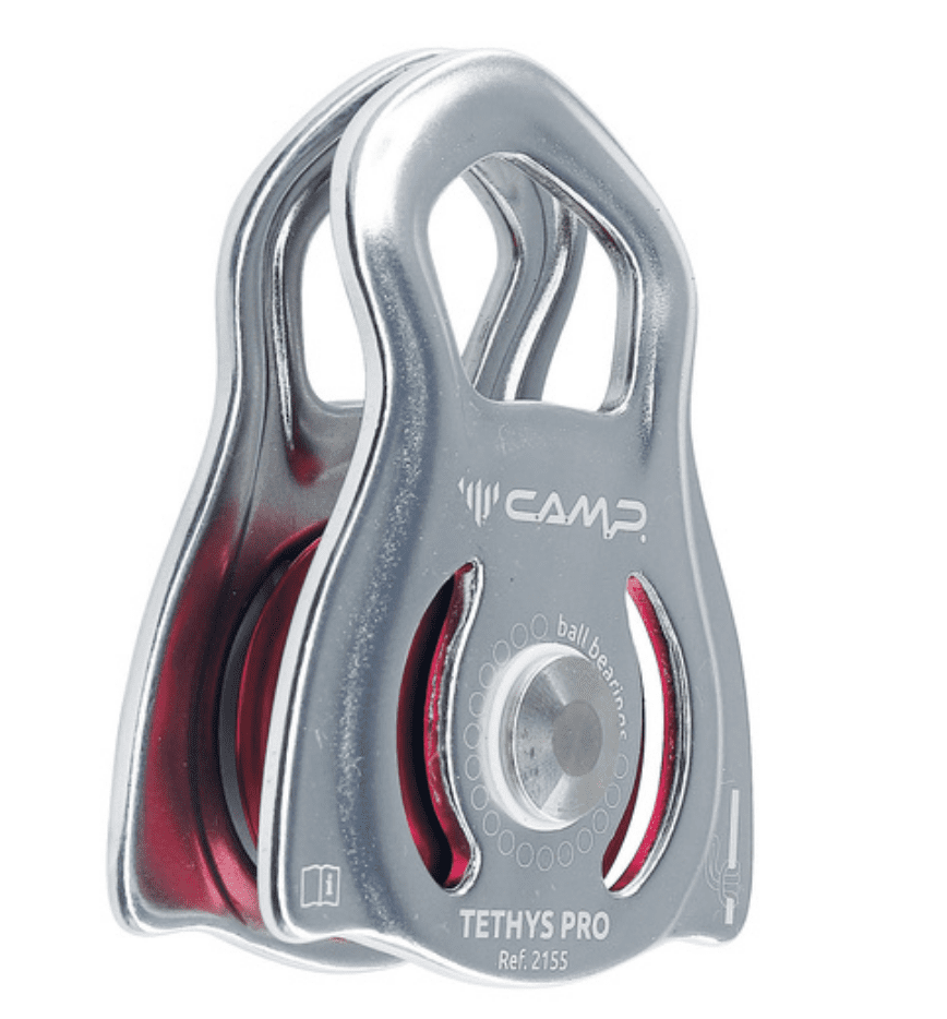 A compact and lightweight pulley with rotating flanges and a large attachment point that accommodates two carabiners.