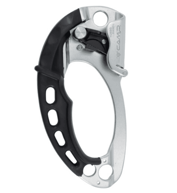 It features a roller. Which not only helps with climbing efficiency by making the upward glide much smoother, it also reduces dangerous wear and tear on the device where the rope tends to rub on the body of a traditional ascender. The ergonomic rubber handle extends into the upper part of the spine to allow for a double-handed grip. The handle and the rope are aligned on the same plane for the best handling and efficiency. Features three large attachment points, two on the bottom and one at the top, for optimal organization. The robust body is constructed from 3.5 mm aluminum alloy. The geometry is verified for use on traverses. The toothed cam is finished with a special anti-wear treatment and features drain holes to help prevent the build up of mud and grit. The opening system is protected on both sides to prevent accidental openings. The proprietary roller also allows the Turbohand to be rigged as a locking pulley for light hauling with a max load of 50 kg, 110 lbs. NOTE: This configuration is not intended for hauling or securing of bodies.
